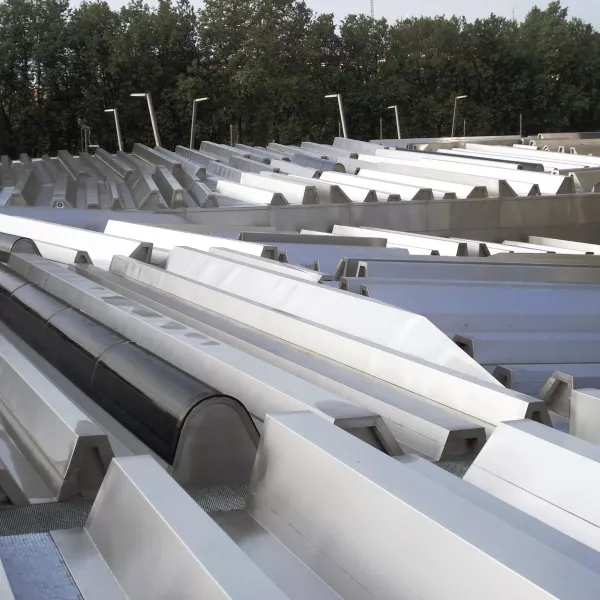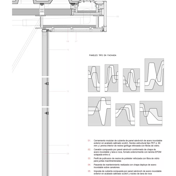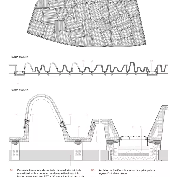 Cubierta / La cubierta se realiza con paneles modulares de 12,00 m x 2,40 m; Para su realización se desarrollan en taller módulos de resina de poliéster reforzados con fibra de vidrio y compuestos por varias capas: una piel exterior estanca de chapa de acero inoxidable de 1,5 mm de espesor; núcleo interior de aislamiento rígido estructural tipo PET laminado a una piel interior de resina de poliéster ignífuga reforzada con fibra de vidrio. El conjunto funciona como un único elemento estructural que garantiza la estabilidad y la resistencia de la cubierta. Los paneles estarán machihembrados en las juntas mediante un perfil de pultrusion de remate para garantizar la estanqueidad. El gran tamaño de los paneles hace que se reduzcan los plazos de ejecución y que el número de juntas entre paneles se minimice, reduciendo así el riesgo de filtraciones.