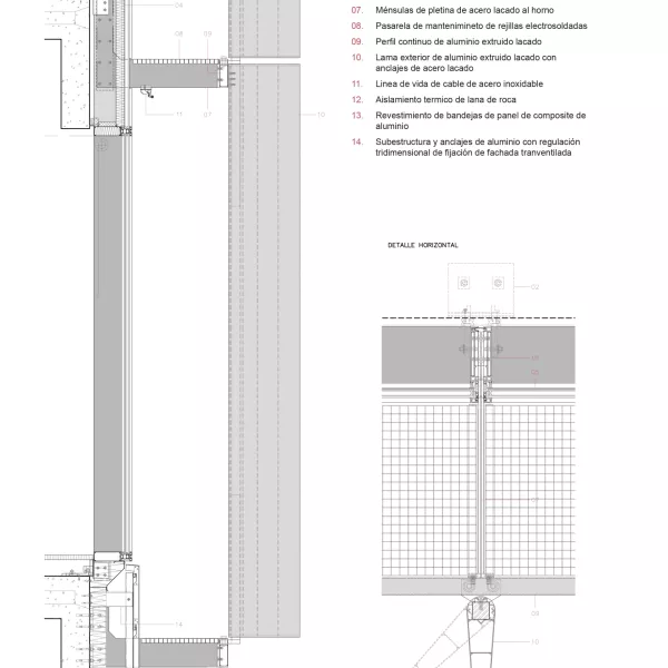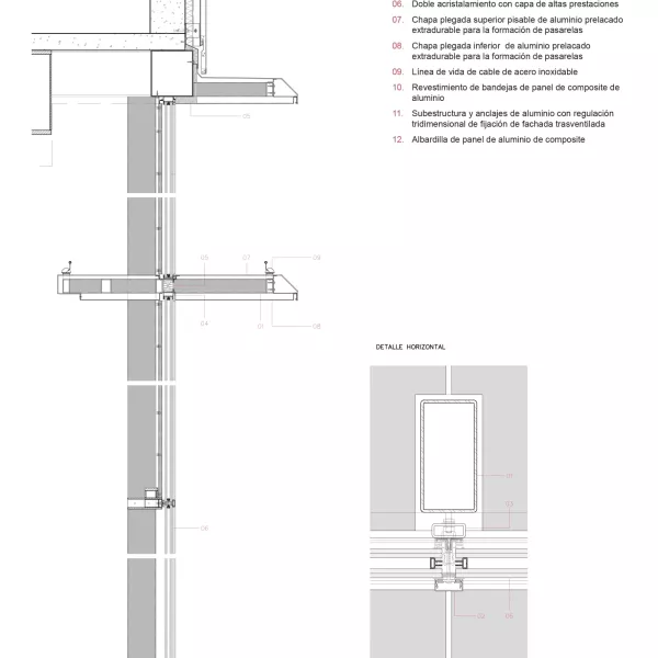 Muro cortina modular pasante por delante de forjado, en plantas superiores, de aluminio con rotura de puente térmico, con pasarelas y lamas verticales integradas dentro del sistema. La modulación es de 1,35m ancho por 4,08m de alto (3,00m visión + 1.08m Opaco).