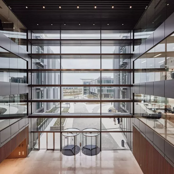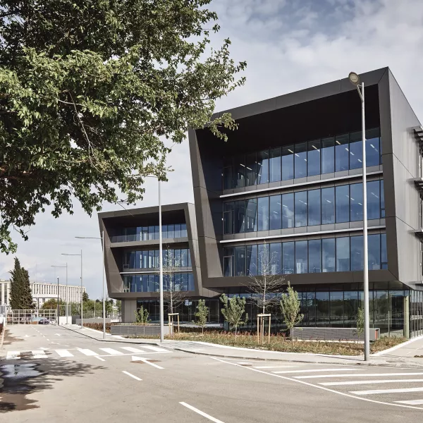 Edificio de obra nueva situado en Getafe, Madrid. El conjunto consta de varias edificaciones independientes en cuyas envolventes se emplearon materiales unificadores ligeros contrapuestos con materiales prefabricados de hormigón. La combinación de estos materiales es la que le proporciona al conjunto su imagen característica, donde destacan las 1667 lamas verticales de aluminio extruido de 4,00m de alto y 45cm de ancho delante del muro cortina modular predominante en las diferentes fachadas, que contrasta con los cerramientos transventilados de composite de las embocaduras, los paneles de hormigón prefabricado grecados del muro principal sobre los que se inscribe el rótulo de la compañía y el muro cortina especial con divisiones de lamas horizontales de gran tamaño del atrio del acceso principal.