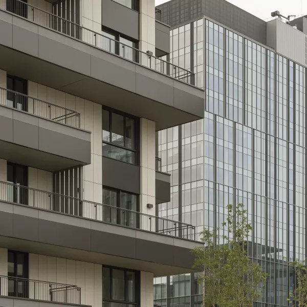 El edificio esta configurado como un único bloque de 6 plantas, cuerpo bajo y una 8va retranqueada, que envuelve la plaza interior por 3 de los lados, siendo rematado en un extremo por una fachada ciega de composite y por volúmenes de 80m de alto en el otro extremo.