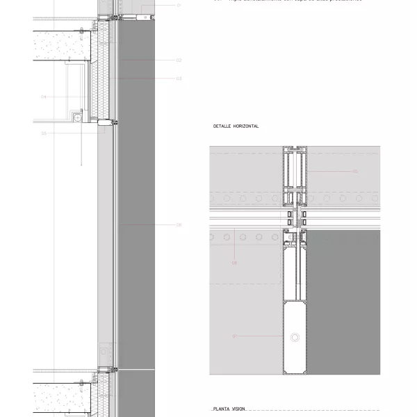 Fachada exterior (2-7) / Sistema modular de muro cortina preindustrializado en taller en su totalidad excepto las lamas exteriores que se fijan a las células en obra antes de su instalación definitiva. Se combinan varias profundidades (hasta 400mm) de lamas con juntas de silicona estructural para formar los ordenes compositivos de fachada.
