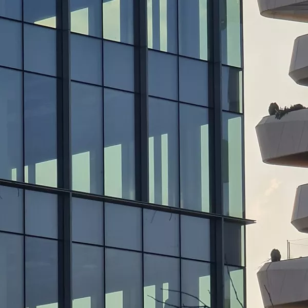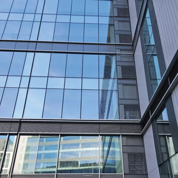 En la composición de la fachada exterior a diferencia de la interior, predomina la superficie acristalada, se combinan vidrios de alta capacidad acústica con vidrios de altas prestaciones térmicas.