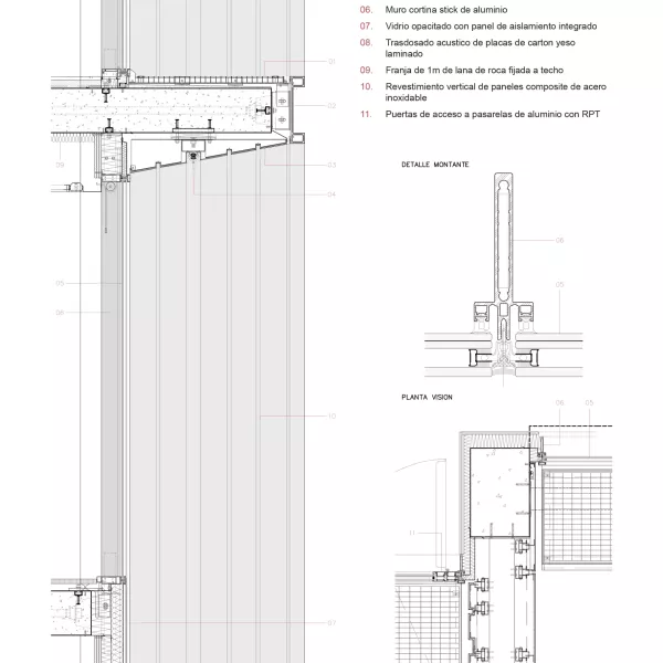 Fachada Norte / Prolongación de la estructura de hormigón mediante forros de rejillas metálicas flotantes, una planta de cada dos, con el fin de formar la sectorización EI en fachada, además de formar unas pasarelas exteriores de mantenimiento. El techo de los aleros se ha forrado de panelado metálico de composite de acero inoxidable con núcleo FR, pre-montados en taller e instalados posteriormente en obra. Muro cortina Stick entre forjados con vidrios fijados mecánicamente a través de su intercalario. En los extremos laterales, el sistema stick es continuo y tiene pasarelas metalicas fijas independientes a pilares.