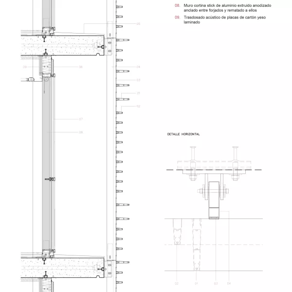 Fachada Sur / Doble piel formada por muro cortina Stick interior, estanquizado y rematado termo-acústicamente entre forjados. La piel exterior está formada por un sistema de celosía de lamas horizontales exteriores ancladas a los cantos de forjado dejando entre ambas una pasarela de mantenimiento de hormigón.