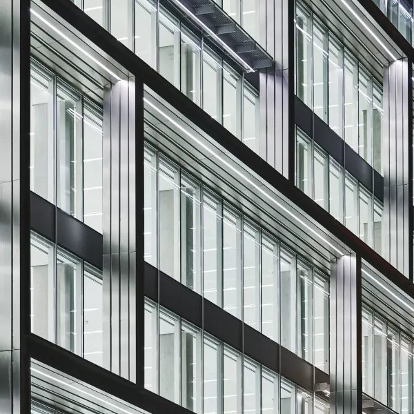 Fachada corpórea de acero inoxidable y vidrio