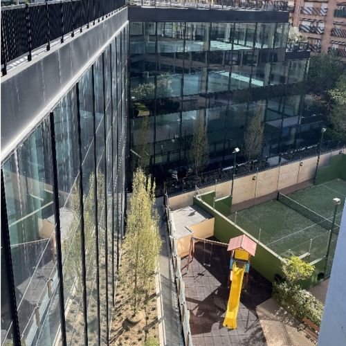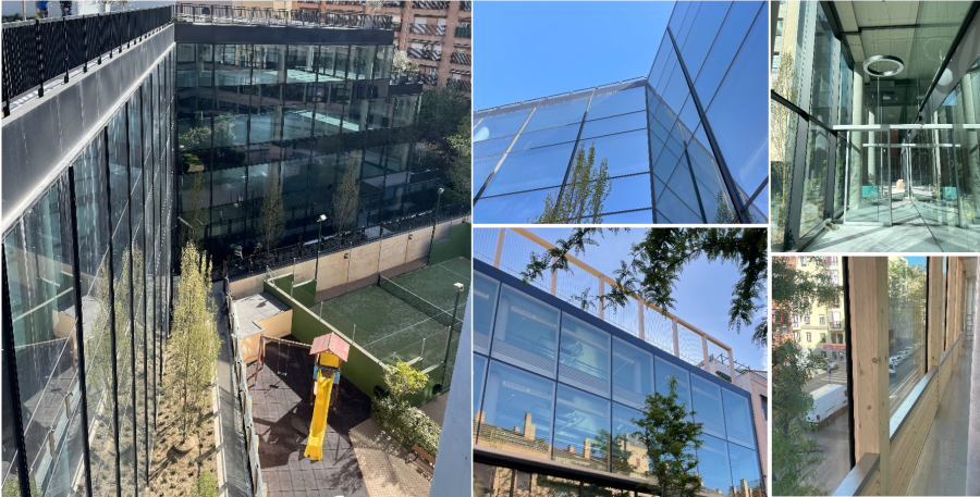 Al interior, las fachadas se resuelven con muro cortina tradicional de aluminio tipo FWS 50 de Schüco y fijación de vidrios mediante presor y tapetas exteriores verticales en forma de U sistema toggle en horizontal. En las zonas opacas se dispondrá interiormente al vidrio un panel sándwich de chapa de aluminio lacada y en las plantas intermedias adicionalmente el sistema de protección a fuego tipo Conlit 150 de ROCKWOOL.