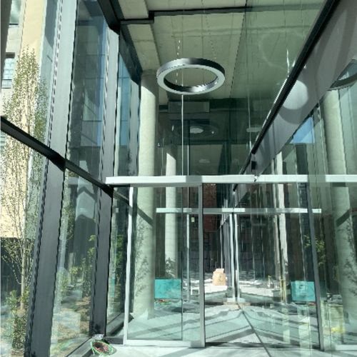 En el vestíbulo de acceso, de doble altura (7,30m), se opta por seguir con el mismo muro cortina, FWS 50, para garantizar la continuidad donde se integran las puertas correderas automáticas de acceso de GEZE con el sistema IGG.