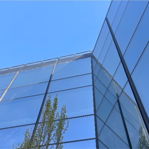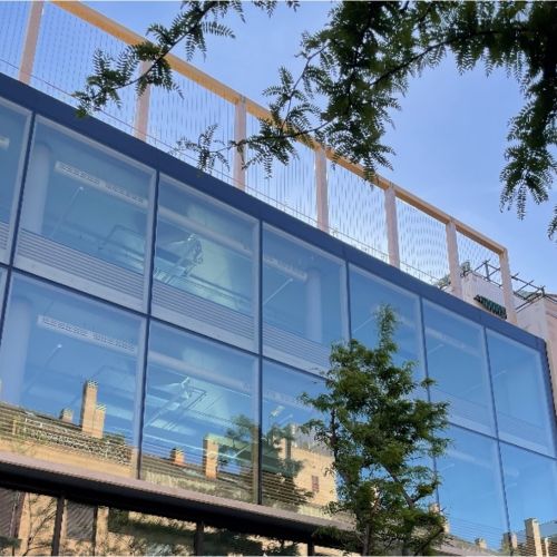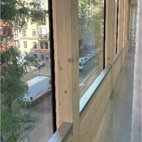 La fachada principal, con modulación 2,70m x 3,90m, cuenta con un muro cortina tradicional con perfilería de madera de pino laminada de 200x200mm y sistema sobrepuesto tipo AOC 75 de Schüco con fijación de vidrio mediante sistema toggle. El acristalamiento en su mayoría es vidrio aislante con capa de protección SOLARLUX 70.