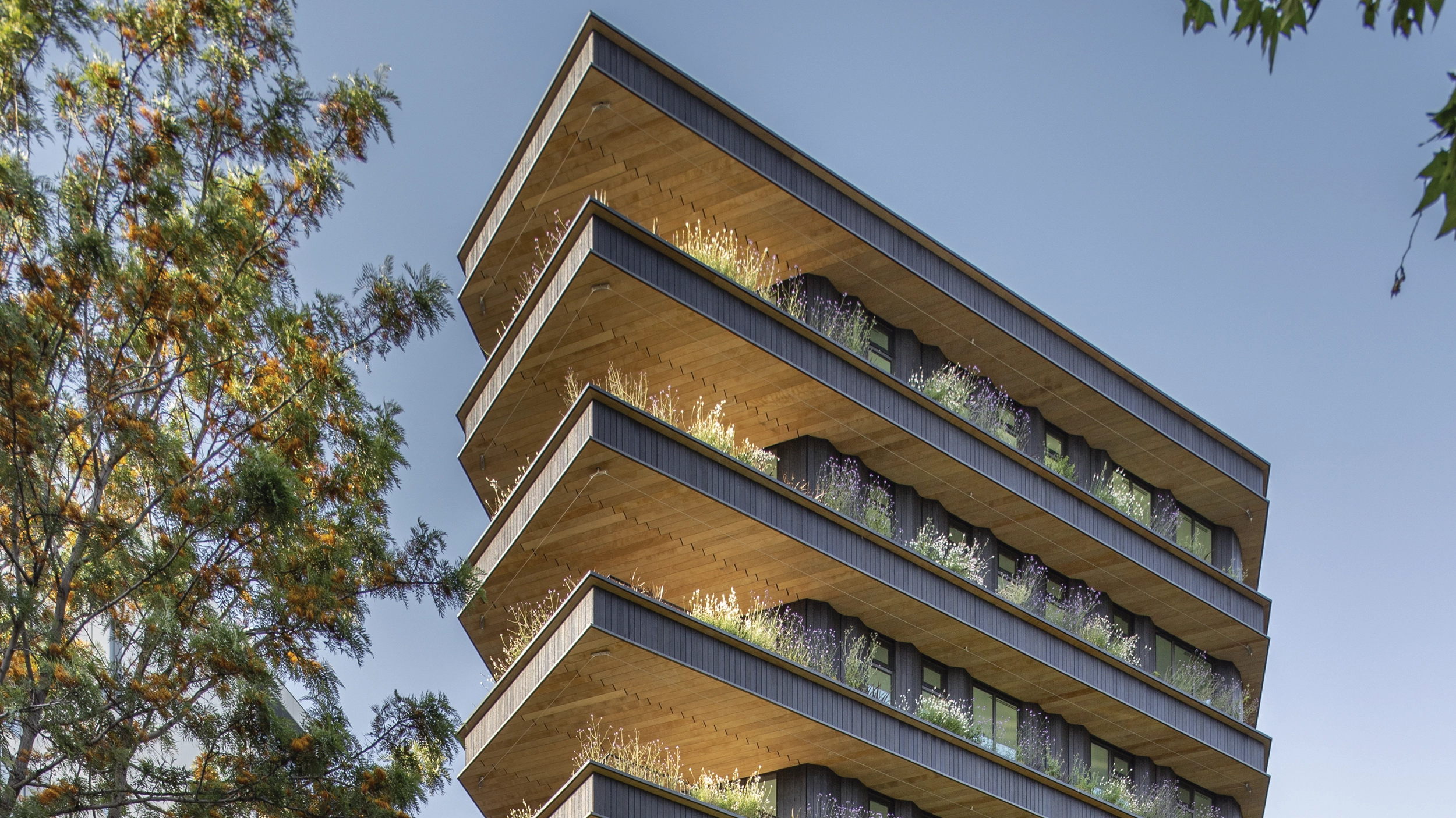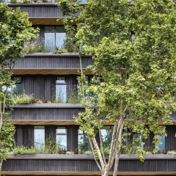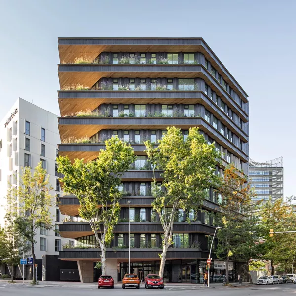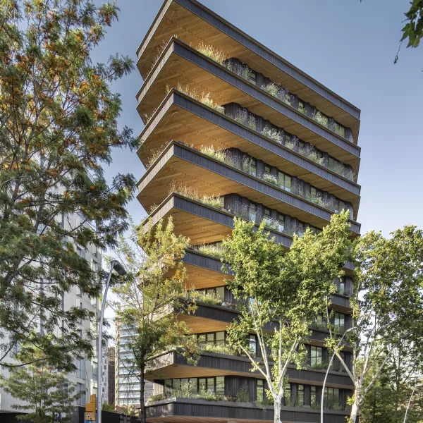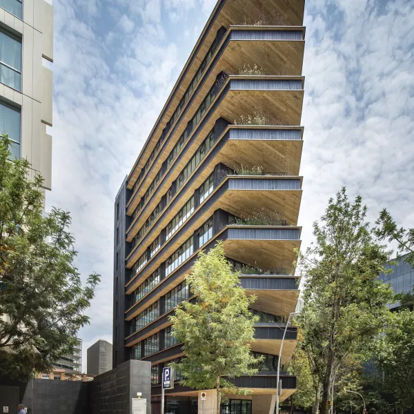 Por encima, ocho plantas de oficinas con fachadas parcialmente acristaladas con voladizos y terrazas ajardinadas, donde el elemento que más destaca es su revestimiento de madera carbonizada.