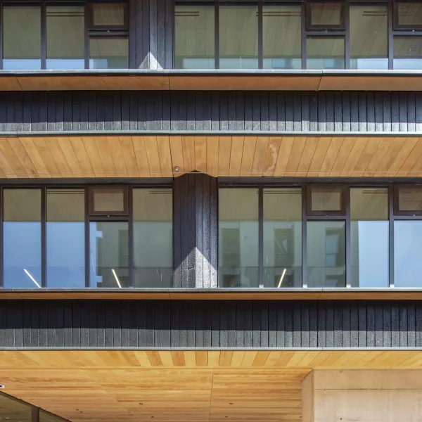 Revestimiento exterior / Sobre los paños ciegos del sistema de cerramiento ligero se colocan los paneles de madera carbonizada para formar la fachada ventilada.