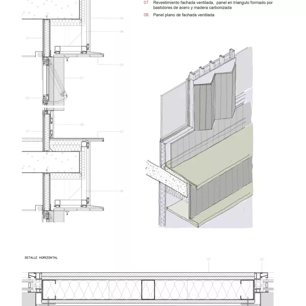 El panel de madera carbonizada se fabrica en taller y llega a obra listo para montar, se trata de un bastidor de acero galvanizado al que se atornillan, por la cara interior, las tablas carbonizadas. Este bastidor lleva los mecanizados necesarios para poder colgarlo de los rastreles, donde se regula y se ajusta la posición definitiva. Hay dos tipos de paneles, los paneles planos colocados en la banda inferior de petos y los paneles en triángulo, en la banda de visión.