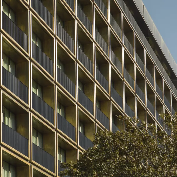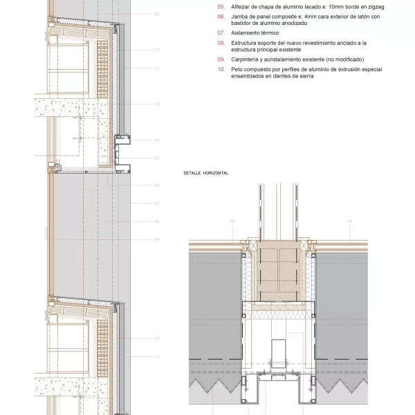 Fachadas Este y Oeste / Cada habitación se enmarca con un módulo prefabricado rectangular (3,80m x 2.85m), ensamblado en taller con perfiles de aluminio de extrusión especial forrados con paneles de composite FR realizado con chapas de latón envejecido y pasivado en la cara vista. El revestimiento de peto, se realiza con perfiles de aluminio de extrusión especial en diente de sierra. La junta entre módulos se resuelve con un foseado de composite color antracita. Finalmente, en obra, se completa el hueco de ventana con el montaje del sofito, las jambas y el alféizar de aluminio.