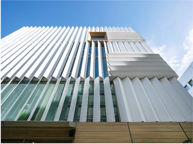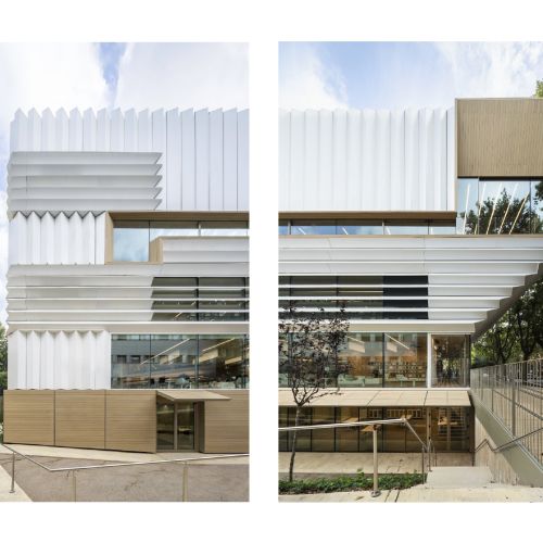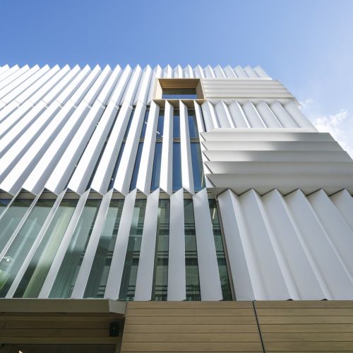 El edificio está construido con estructura de madera contralaminada y sobre ella se ha instalado una fachada ventilada con lamas de composite GRP en distintas orientaciones. El diseño del estudio de arquitectura perseguía simbolizar a mayor escala el canto blanco del interior de los libros.