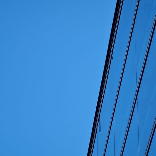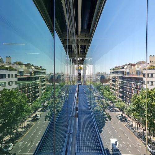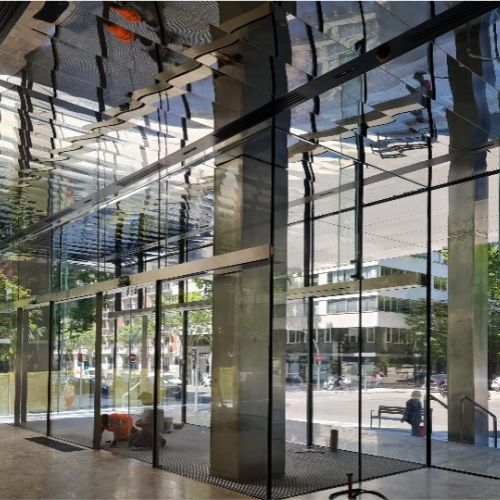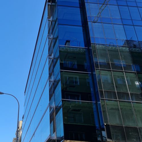 Los vidrios exteriores tipo son ultra selectivos de Guardian Glass SNX 50/23 , y los vidrios de los patios Sunguard SN 70/37, que tienen una trasmisión luminosa mayor. Las fachadas se coronan con barandilla de vidrio laminar low iron 10.10 fabricado por Astiglas y con sistema de carril para mantenimiento por descuelgue de línea rígida Unirail, instalado por Garsan Sianor integrada en albardillas.