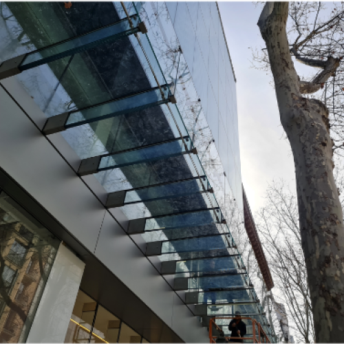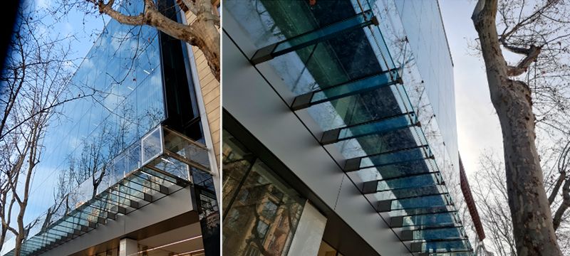 La marquesina está compuesta por un suelo pisable apoyado en unas ménsulas de vidrio laminado en cuyo extremo se apoyan los vidrios de antepecho y se insertan otros candeleros de vidrio que estabilizan el peto y sirven de soporte del pasamanos.