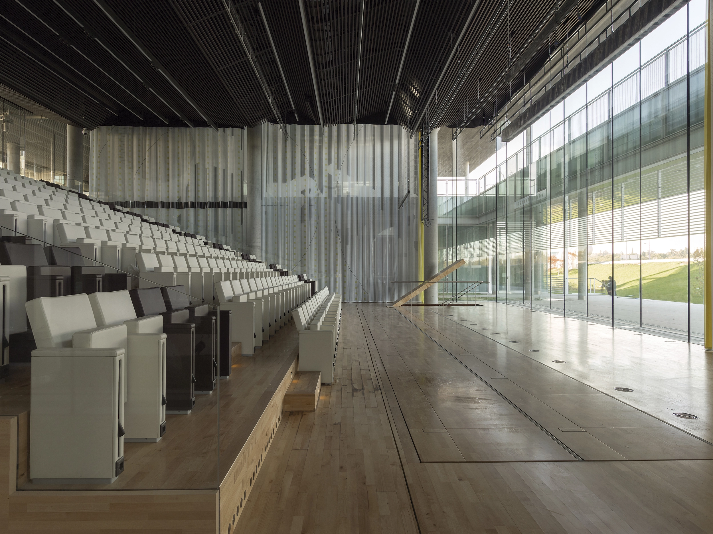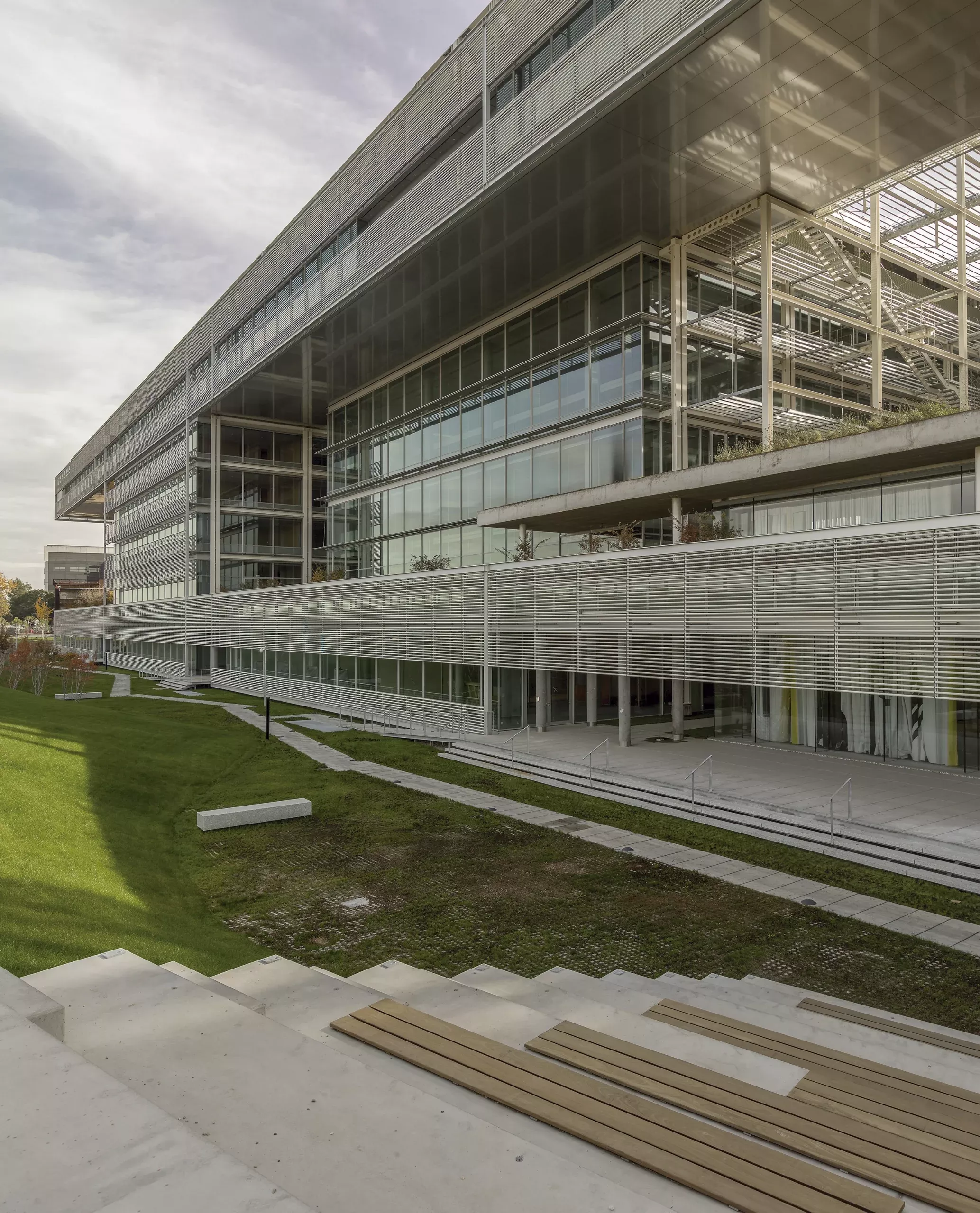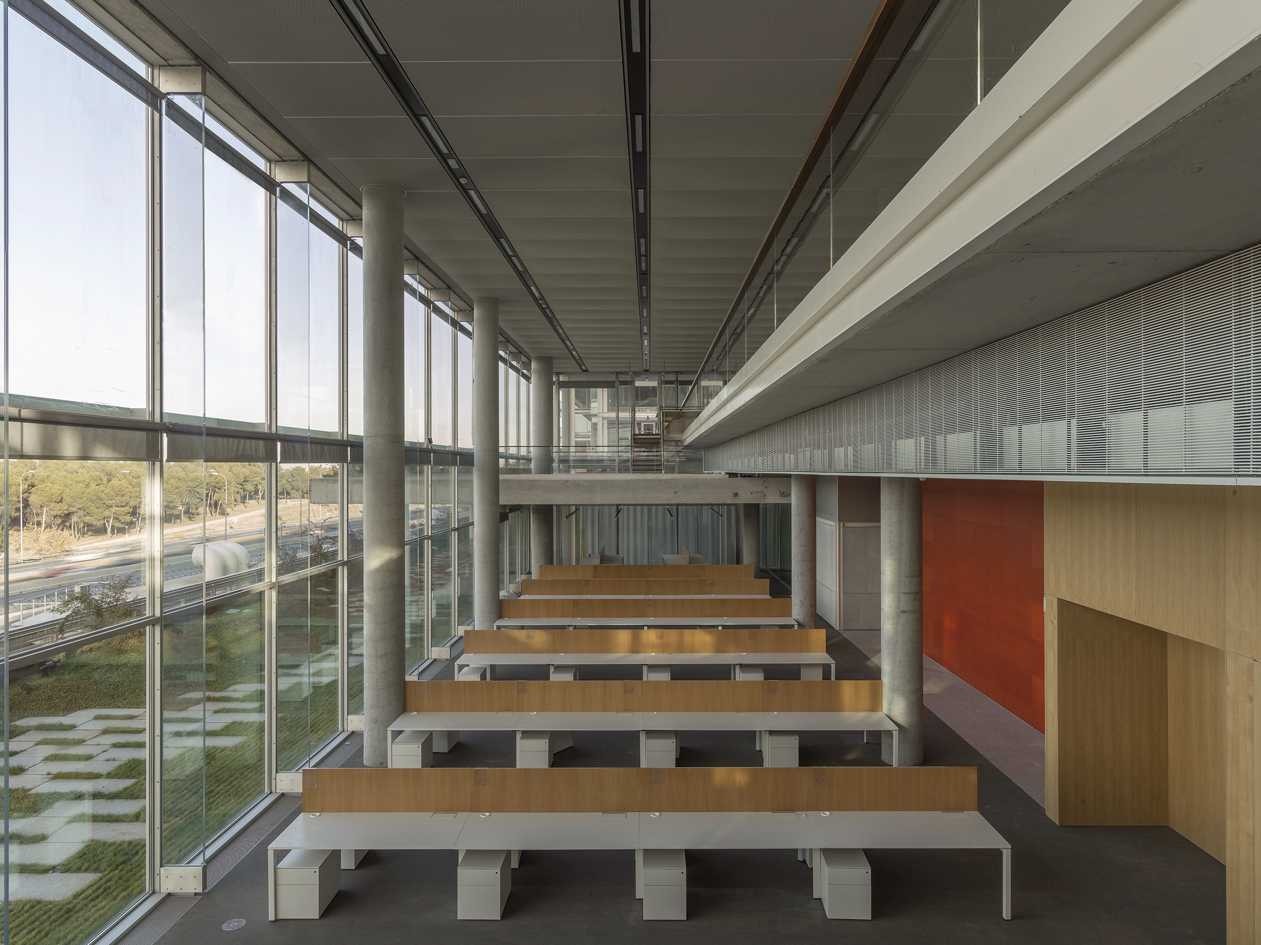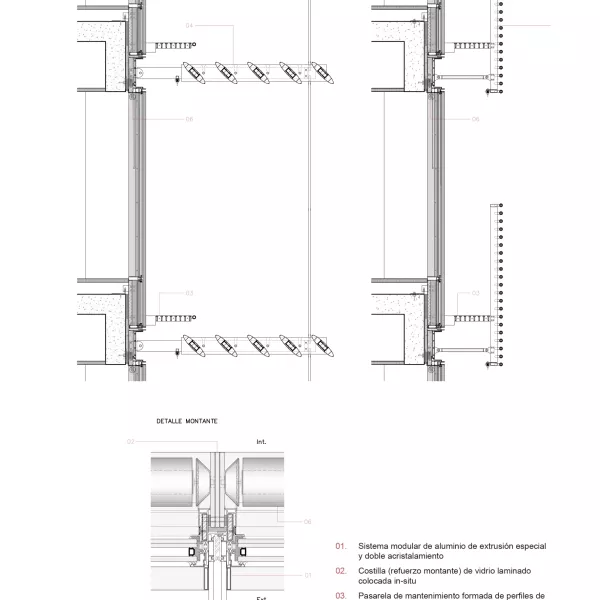 El edificio incorpora fachadas singulares, como las de los espacios a doble altura, resueltas también con sistema modular de gran dimensión, en este caso soportado por costillas de vidrio de 8m de altura y 40cm de canto. O el cerramiento del salón de actos, que es un gran cubo formado por una envolvente doble mediante vidrios de gran formato (10m de alto) que a su vez están atados por costillas, también de vidrio, perpendiculares.