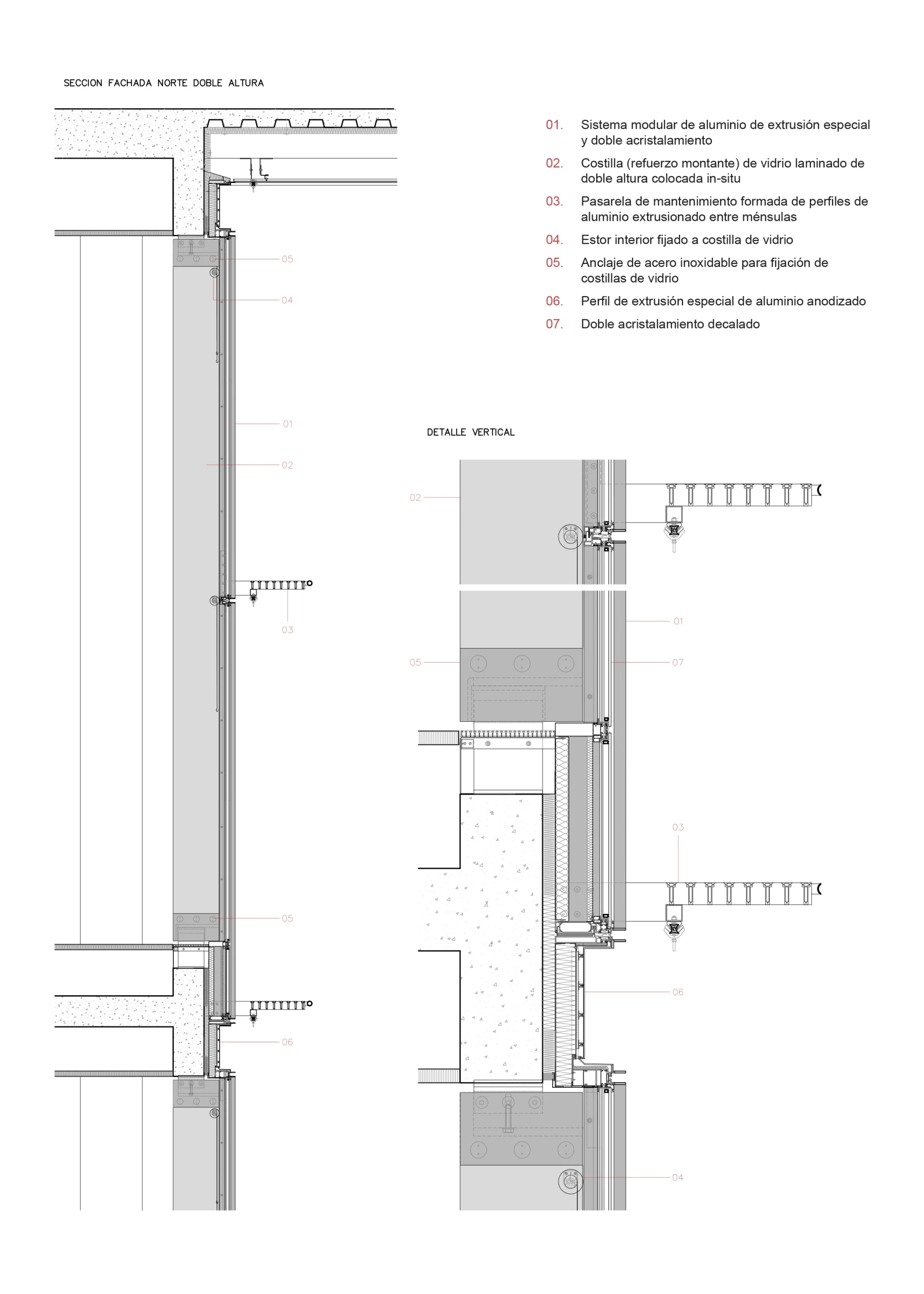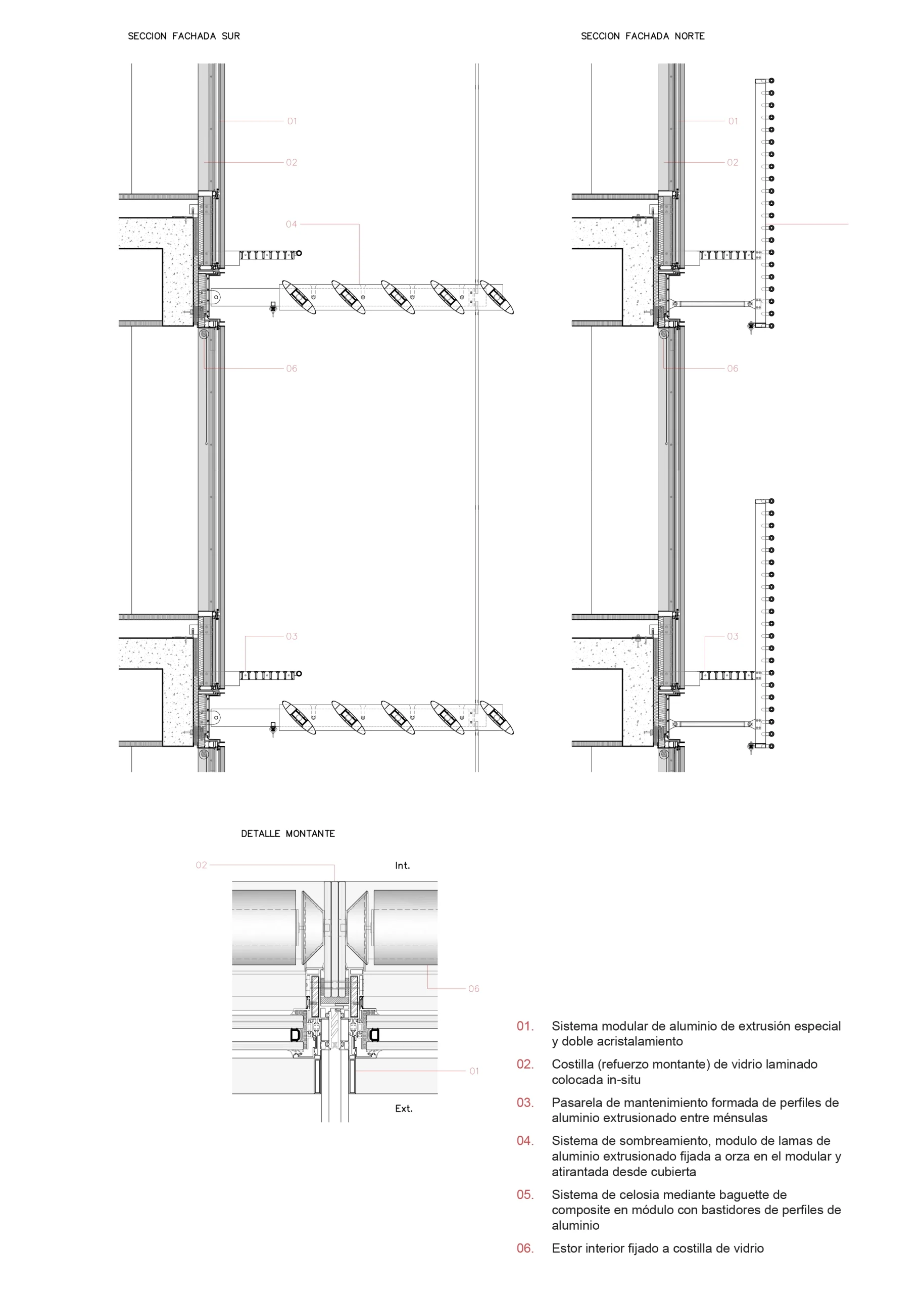En fachada Norte la envolvente se convierte en una fachada doble piel al disponer una celosía exterior configurada mediante módulos de baguettes (sección circular) horizontales de pultrusión de poliéster y fibra de vidrio.