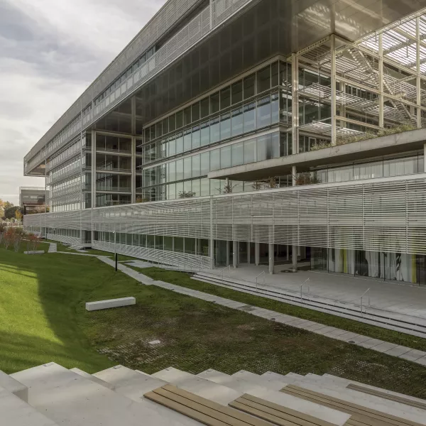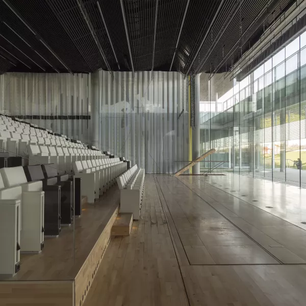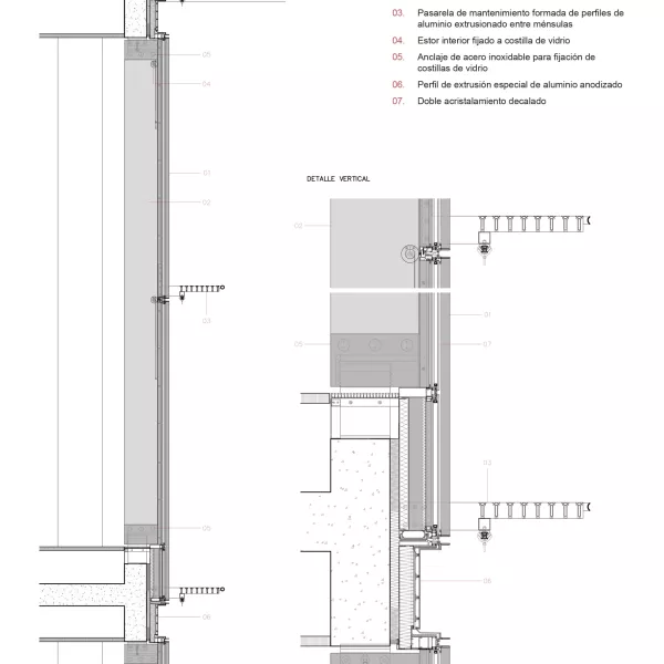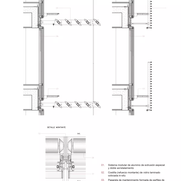El edificio incorpora fachadas singulares, como las de los espacios a doble altura, resueltas también con sistema modular de gran dimensión, en este caso soportado por costillas de vidrio de 8m de altura y 40cm de canto. O el cerramiento del salón de actos, que es un gran cubo formado por una envolvente doble mediante vidrios de gran formato (10m de alto) que a su vez están atados por costillas, también de vidrio, perpendiculares.