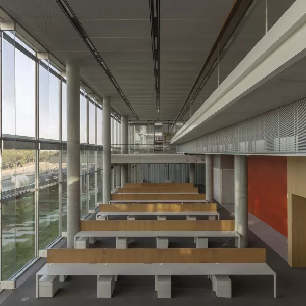 En fachada Norte la envolvente se convierte en una fachada doble piel al disponer una celosía exterior configurada mediante módulos de baguettes (sección circular) horizontales de pultrusión de poliéster y fibra de vidrio.