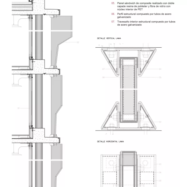 Lamas de sombreamiento / Con el fin de reducir al máximo el peso de las lamas, y para poder fabricar elementos de grandes dimensiones sin juntas visibles, las lamas se diseñan como elementos autoportantes compuestas por una estructura metálica revestida por laminados tipo sándwich de resina de poliéster reforzada con fibra de vidrio, y núcleo interior estructural tipo PET. Las lamas se acaban con una pintura exterior a base de poliuretanos alifáticos de alta durabilidad.