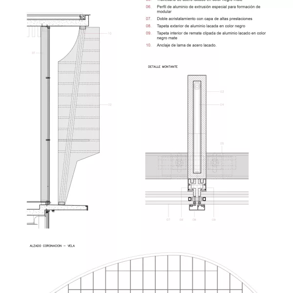Fachada del edificio “Vela” / Debido a las grandes cargas de viento y grandes alturas entre plantas, se diseña un sistema de fachada mixto: sistema tradicional de montantes y travesaños de acero; sistema modular de aluminio adosado sobre el anterior, que permite un montaje de mayor calidad y rapidez para garantizar la estanqueidad de la fachada al exterior.