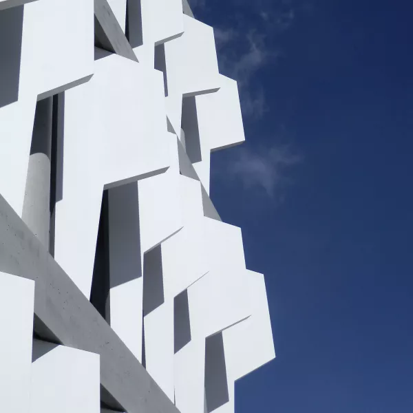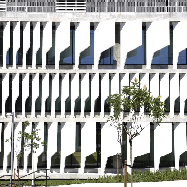 La fachada del edificio zócalo se identifica por la existencia de unos elementos de sombreamiento cuya forma variable define la imagen exterior del edificio.