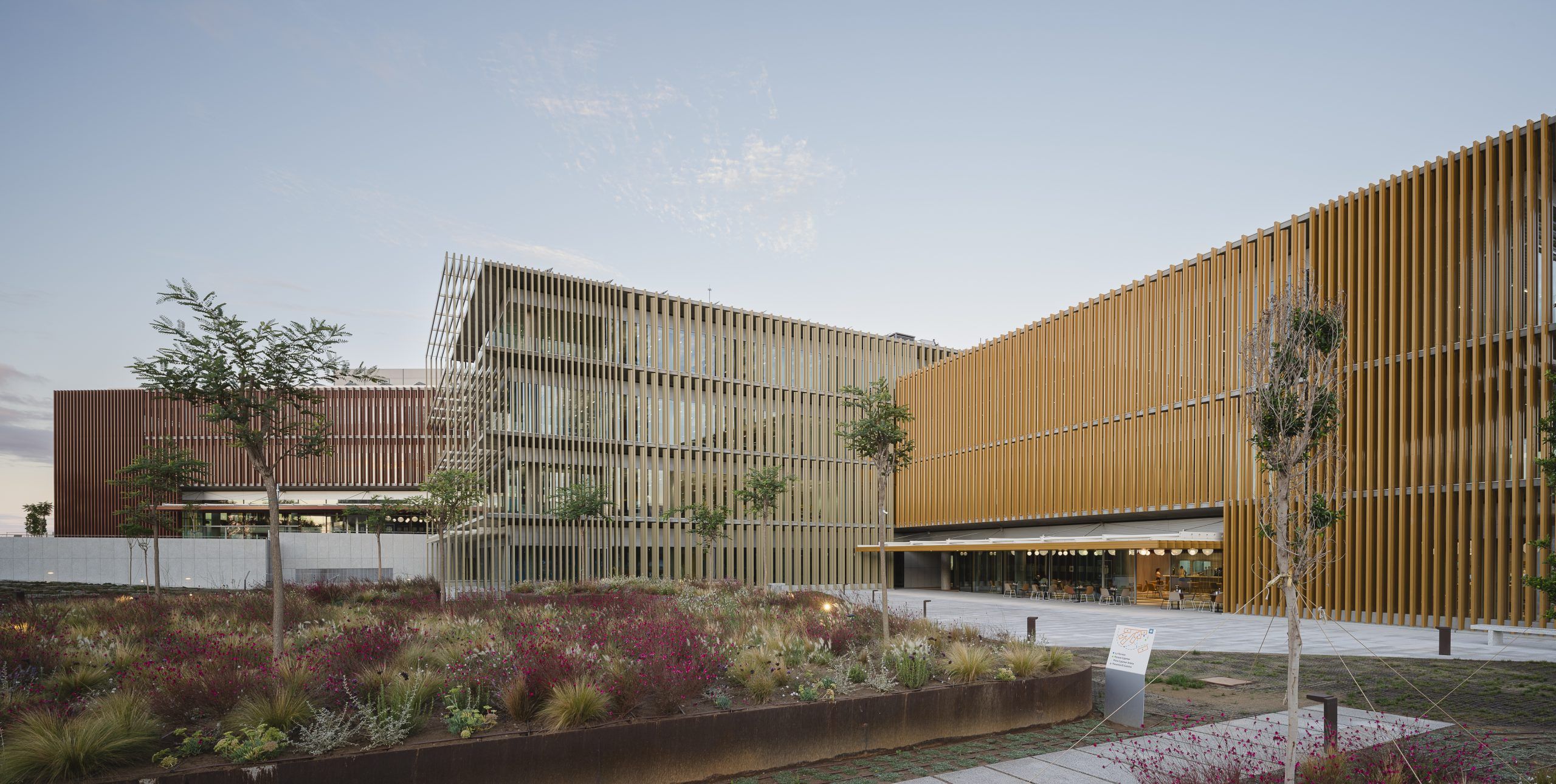 El edificio se caracteriza por los prefabricados de hormigón situados en el canto del forjado, que forman unas pasarelas perimetrales. La envolvente térmica se sitúa en la cara interior, con un muro cortina entre los prefabricados, con vidrios se suelo a techo y despiece coordinado con la posición de los pilares, resultando paños de unos 3 metros de alto x 4,05 de ancho medio. En la cara exterior del prefabricado se sitúa un peine de dobles lamas de aluminio lacadas en distintos colores según el bloque, donde la lama de la cara interior se gira en función de la orientación de la fachada para garantizar la protección solar de la fachada acristalada.