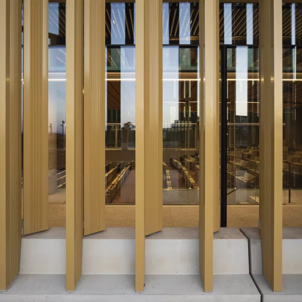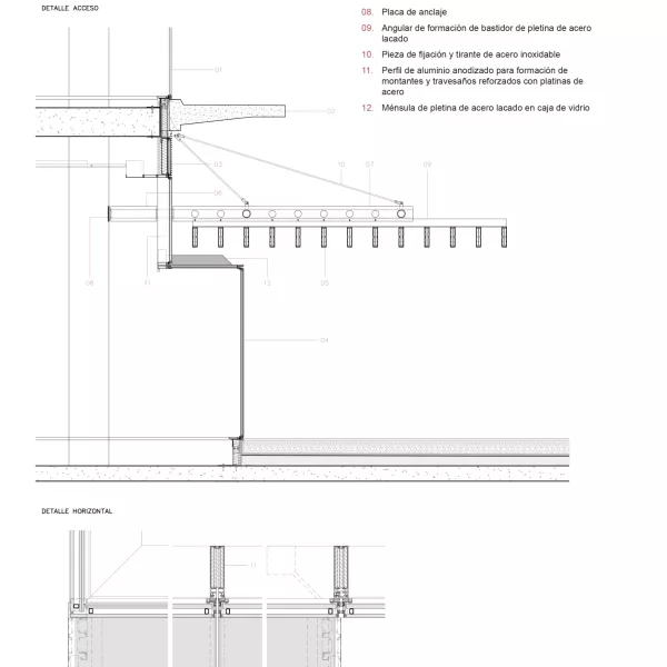 Destaca el espacio del vestíbulo, donde los volúmenes de los prefabricados y las lamas llegan al interior y se maclan con el espacio de triple altura. Aquí se sitúa un cerramiento de vidrio serigrafiado con orientación sur, soportado por costillas de vidrio de unos 10 metros de altura.