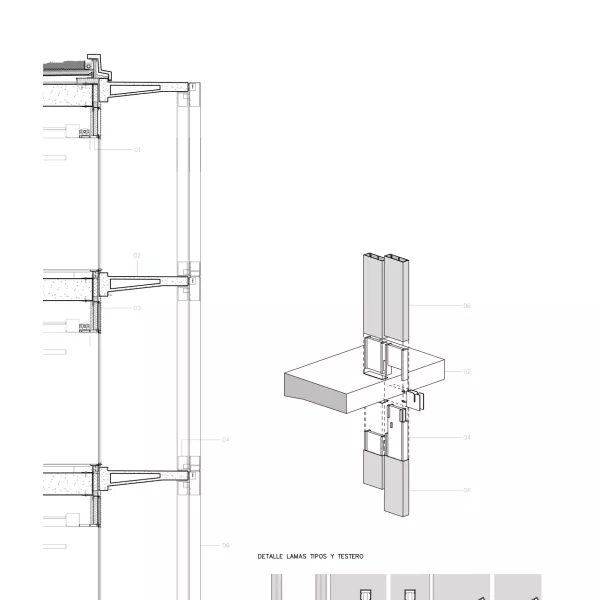 En los testeros se sitúan unas terrazas con barandillas de vidrio. Las lamas aquí son perpendiculares y de doble densidad, con lamas también en la horizontal, a la altura de los prefabricados, soportadas por ménsulas de acero en voladizo desde la fachada.