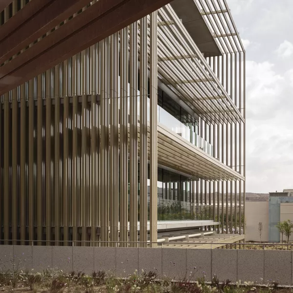 El edificio se caracteriza por los prefabricados de hormigón situados en el canto del forjado, que forman unas pasarelas perimetrales. La envolvente térmica se sitúa en la cara interior, con un muro cortina entre los prefabricados, con vidrios se suelo a techo y despiece coordinado con la posición de los pilares, resultando paños de unos 3 metros de alto x 4,05 de ancho medio. En la cara exterior del prefabricado se sitúa un peine de dobles lamas de aluminio lacadas en distintos colores según el bloque, donde la lama de la cara interior se gira en función de la orientación de la fachada para garantizar la protección solar de la fachada acristalada.